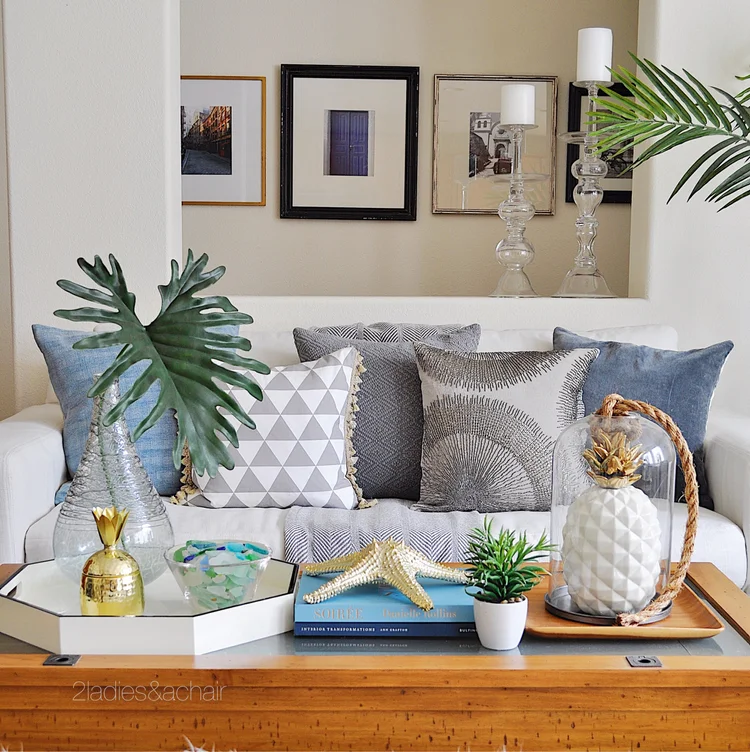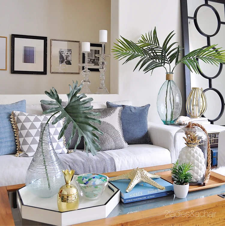 As some of you know I live on Monterey Bay on the coast of California. I am inspired by my surroundings when decorating for summer. On our many beach walks my husband and I have collected sea glass, driftwood, and sand dollars. Strolling along the beach and finding these colorful treasures brings a natural enjoyment. I'm using sea glass as my color palette in my family room. All the elements of the sea, combining sea, sky, and sand in gorgeous shades of blue, green, and grey. Continuing with the glass theme I also pulled out large glass bottles for displaying green leaves.