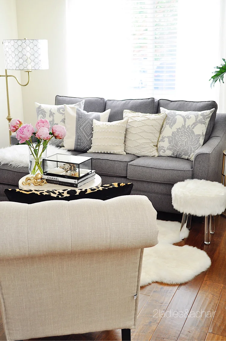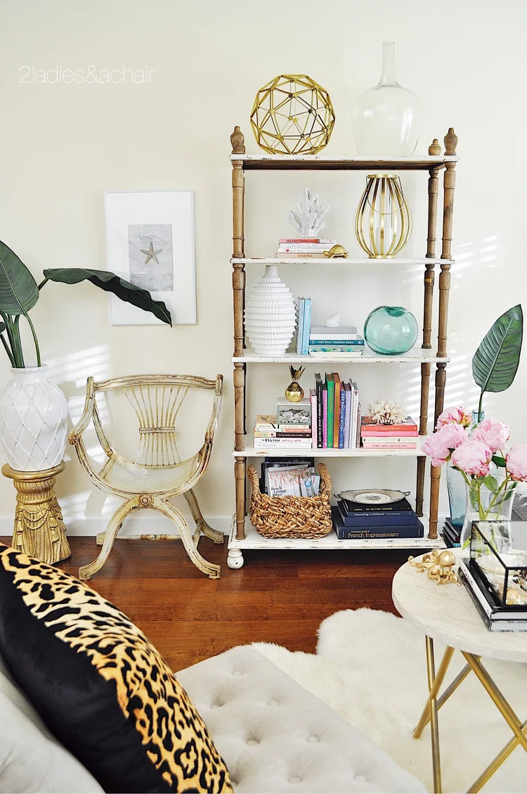Flowers are everywhere in the summer. So I'm inspired to put floral prints and casual flower arrangements in my living room. Right now I can't resist these pink peonies from Trader Joe's. Soon I'll have flowers from my garden, alstroemeria and hydrangeas. I lighten up the bookcase and added a few coastal touches.